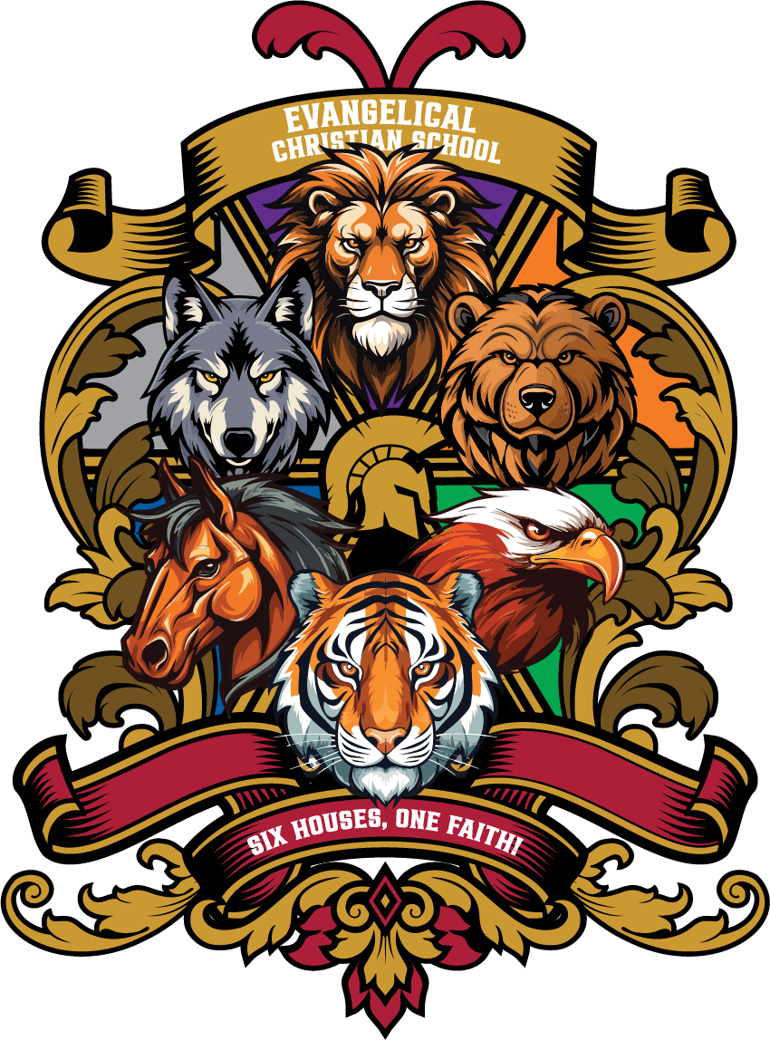 This bold and beautifully detailed crest represents the heart of the Evangelical Christian School House System, uniting all six houses under a banner of faith, unity, and strength.