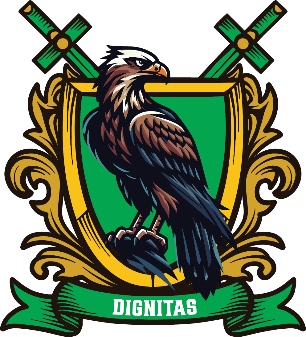 The falcon, perched sharply on the right, soars with honor and precision. Dignitas leads students to walk with integrity, humility, and a deep respect for God and others.