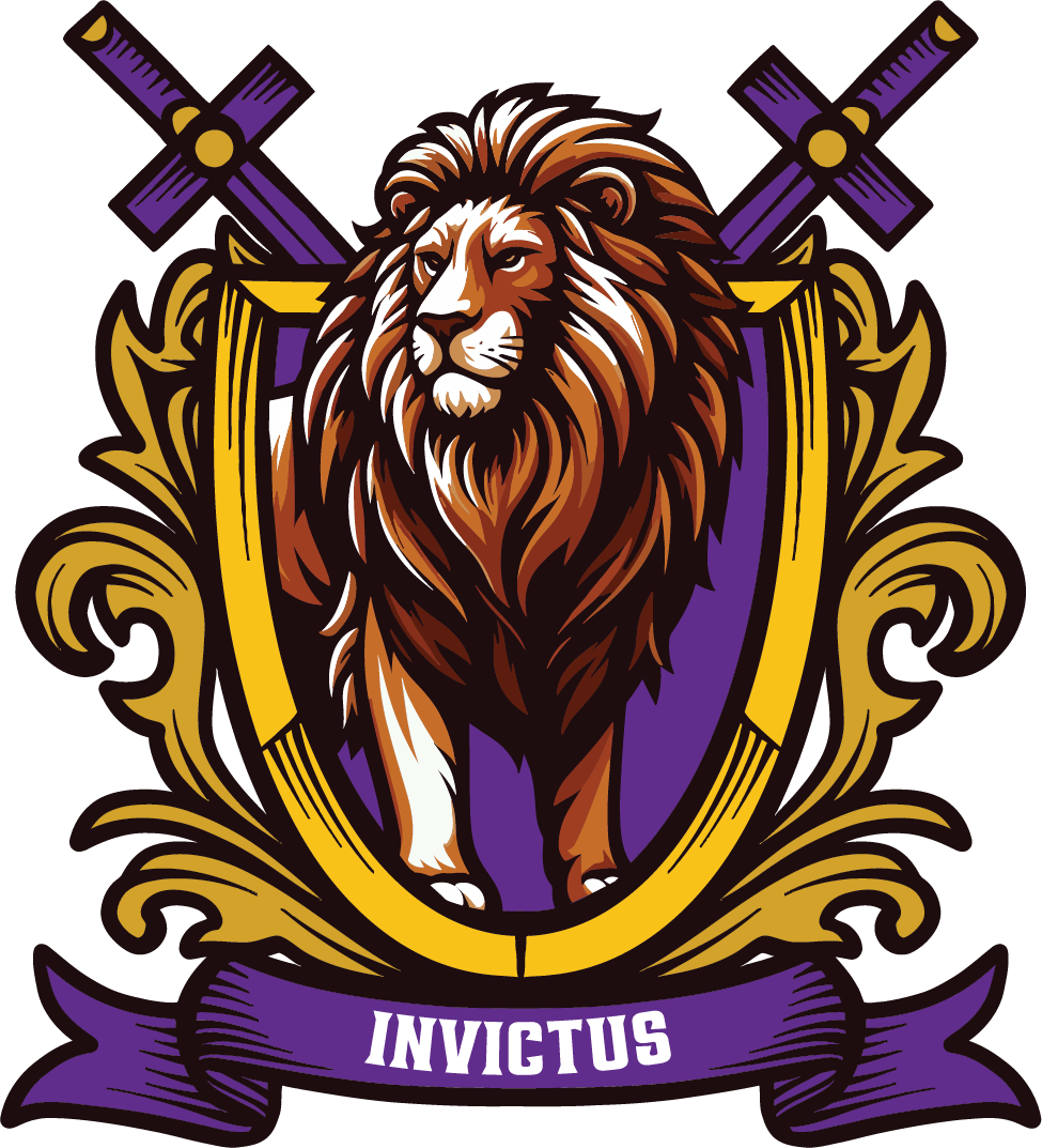 The majestic lion reigns over the crest—a sign of courage, strength, and royalty. Invictus represents a spirit that cannot be broken, standing firm in faith no matter the battle.